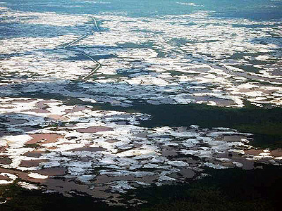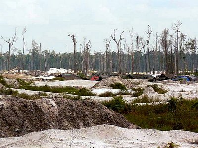 | Hutan tropis mengelilingi tempat penambangan di tengah-tengah lubang tambang terbuka. |