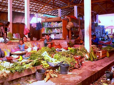 | Pasar sayur mayur di pusat kota yang dikelilingi oleh toko emas yang mengeluarkan asap merkuri. |