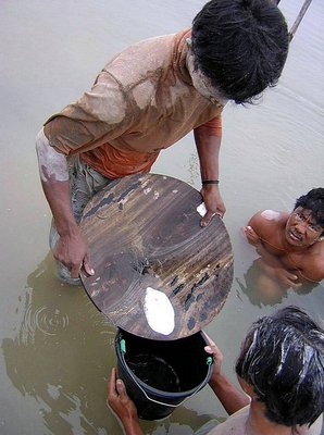 | Merkuri dan bijih konsentrat diaduk dengan tangan. |