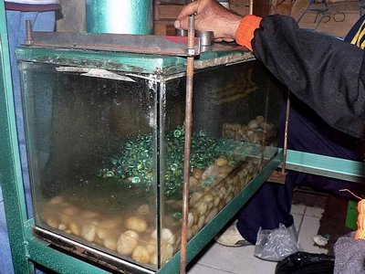 | Bola kelereng membantu kondensasi uap merkuri di dalam jebakan air. |